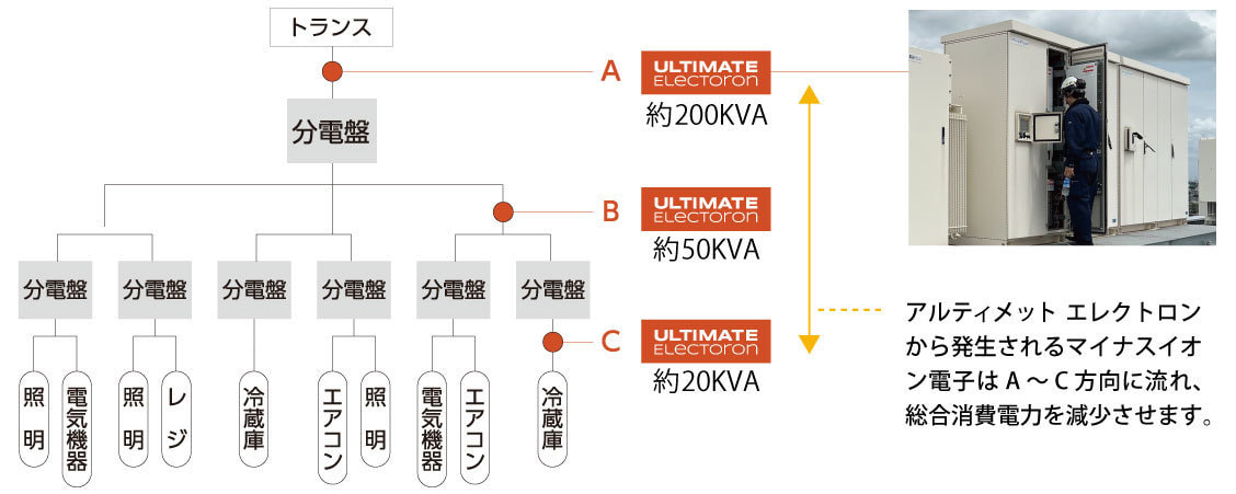 A,B,Cの部分にアルティメット エレクトロンを設置することにより、電流がれるときの損失している電流を減少させ、総合消費電力が減少されます。